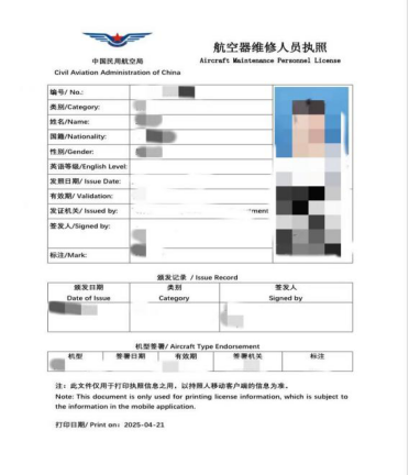 职业资格证:民用航空器维修人员执照(CCAR-147)、钳工证等。