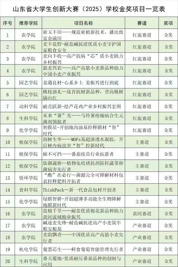 在大赛过程中,我校学子秉持“敢闯会创”的精神,通过精彩的现场路演赢得评委的一致认可,实现三大突破:一是奖项数量再创新高,20项金奖位居省属高校第一;二是产业命题金奖取得历史性突破,农学院、生科学院、机电学院共摘得4金(其中农学院2项);三是参赛学院覆盖面显著拓宽,13个学院晋级决赛,9个学院斩获金奖(农学院7项,植保学院3项,园艺学院、生科学院、化学学院各2项,资环学院、动科学院、机电学院、食科学院各1项),圆满达成2025年大赛“提质扩面”目标。