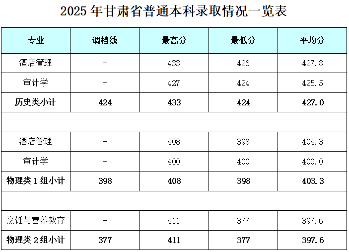 甘肃省普通本科批次实行平行志愿投档模式,历史类在甘调档线为424分;物理类1组(不限选考)在甘调档线为398分;物理类2组(选考生物)在甘调档线为377分。(详见“2025年甘肃省普通本科录取情况一览表”)。