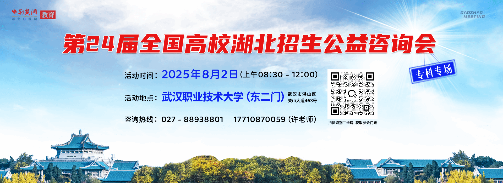 2025年湖北省高考专科批次志愿填报在即!为助力广大考生精准填报专科志愿,开启精彩大学生活,8月2日上午08:30-12:30,第24届全国高校湖北招生咨询会·专科专场将在武汉职业技术大学(东区)震撼来袭。本次活动集“高校招生现场咨询服务”“专科志愿专家报告会”“专升本公益报告会”“专科志愿公益咨询服务”“校园开放日”“志愿填报指导资料赠送”于一体,一站式解决升学困惑,助力全省高考家庭圆梦高考!
