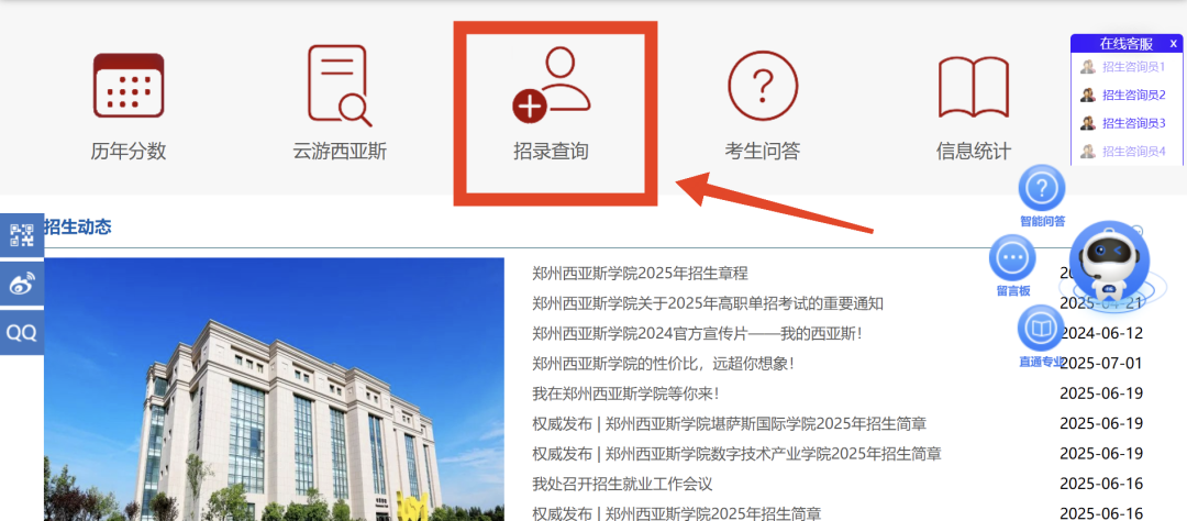 关注“郑州西亚斯学院招生办公室”微信公众号,在下方菜单栏的“2025高招”找到“录取查询”入口,点击后,按提示输入个人信息进行查询。