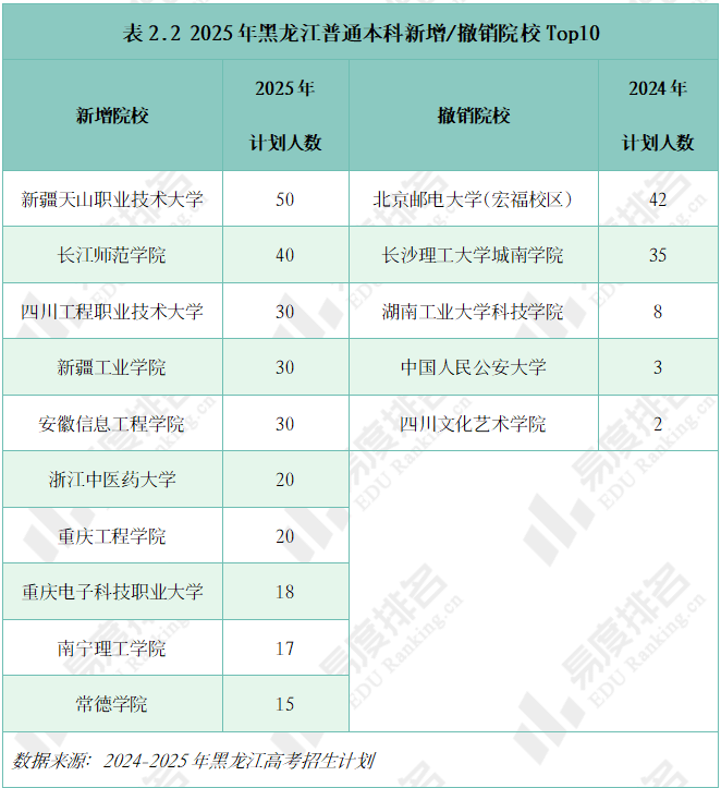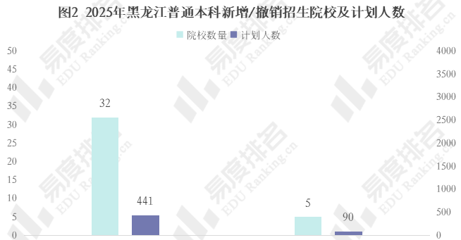 相比去年,今年新增32所高校在黑龙江招生,新增院校的招生计划人数达到441人。撤销招生计划的院校仅有5所,这5所高校去年的招生计划仅90人。