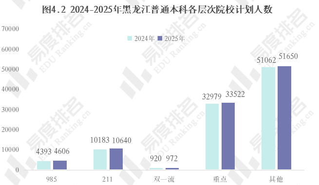 近两年在黑龙江招生的重点以上层次院校数量基本稳定,各层次院校的招生计划则继续保持增长趋势,985、211高校的计划占比也有所上升。其中985高校的计划占比从去年的4.41%升至4.54%,211高校则从10.23%升至10.45%。高层次高校的名额竞争有所缓解。