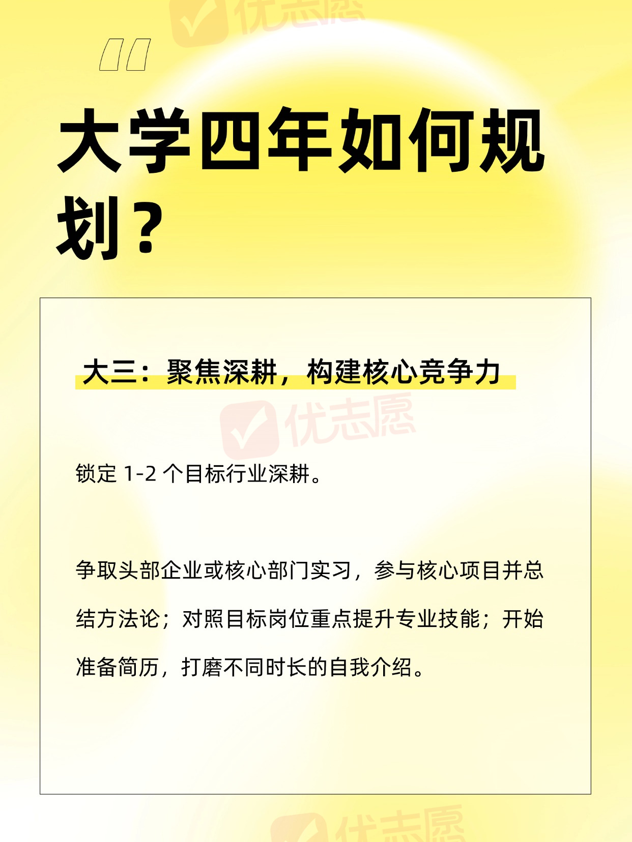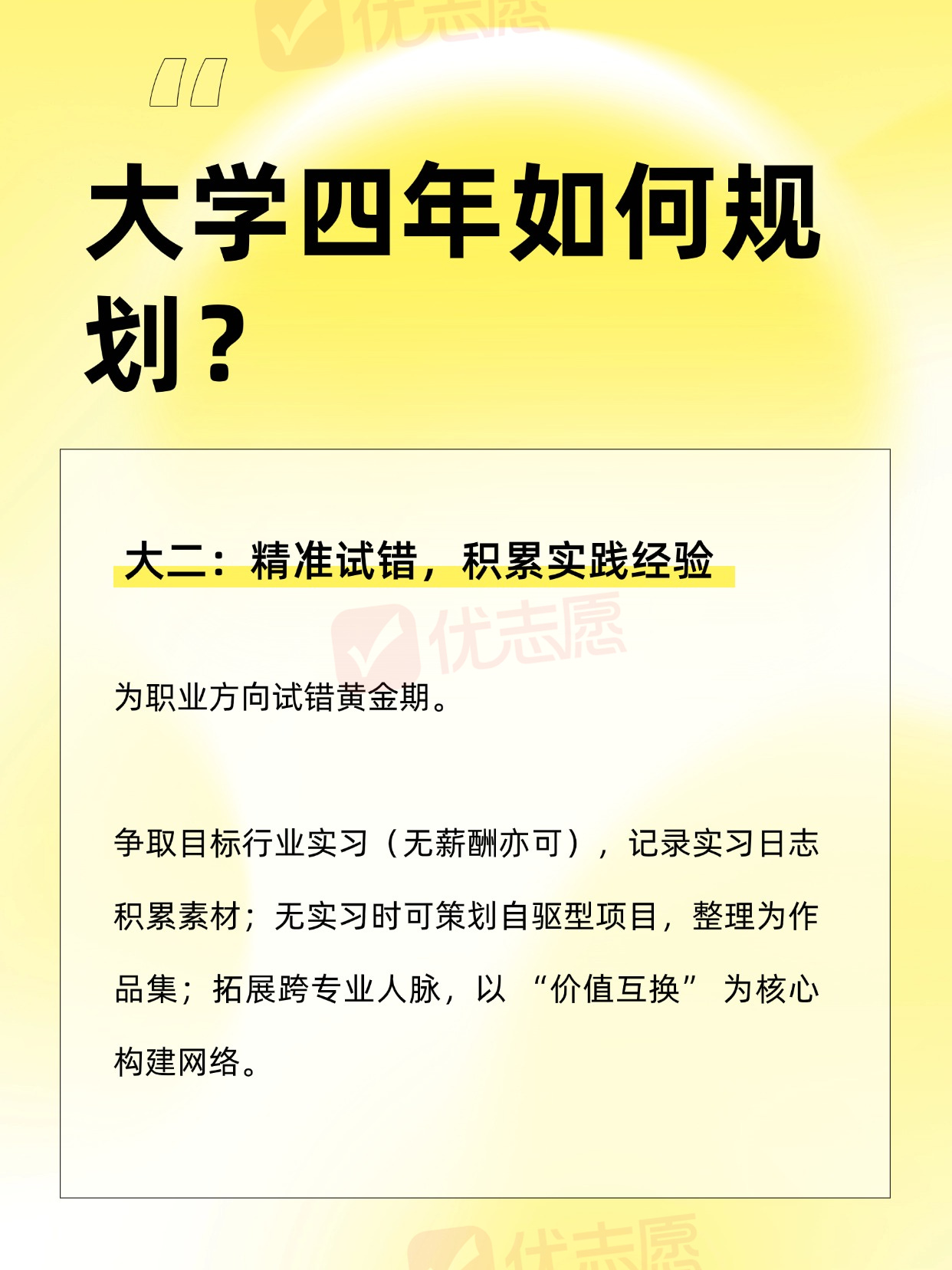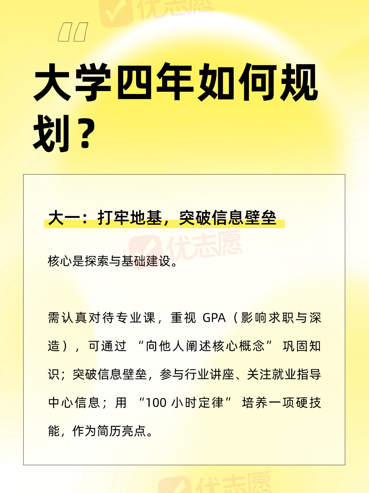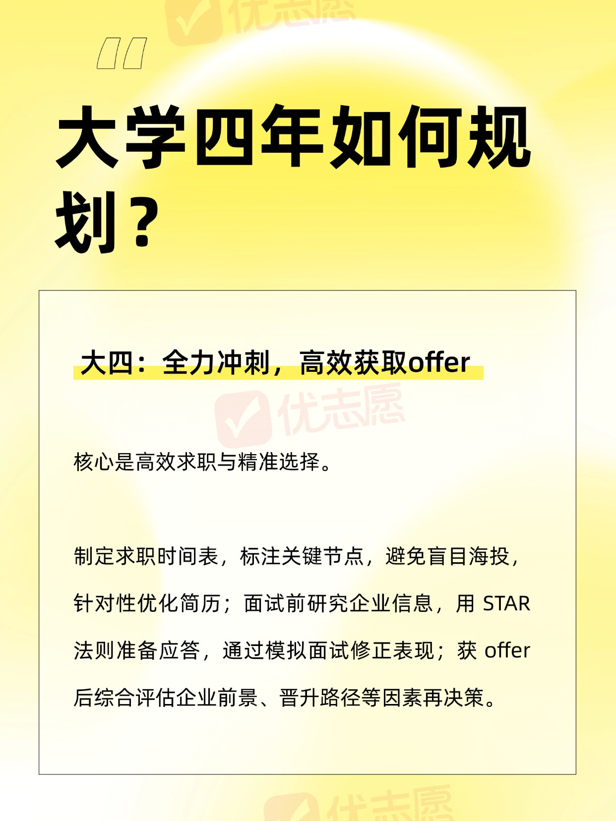 请大数据把我推给准大一新生们!每年毕业季,“毕业即失业” 的焦虑困扰着许多应届生。那些手握多个工作机会的求职者,往往得益于大学四年的系统性规划。以下为可落地的分阶段规划方案,助力学生从大一开始逐步提升竞争力!