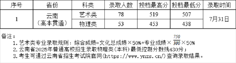 根据2025年各省、自治区招生考试委员会办公室(考试院)招生录取流程安排。截止2025年7月31日,我校已完成云南省(高本贯通)的录取工作,录取批次:高职(专科),学制:三年。 具体分省分科类录取情况如下: