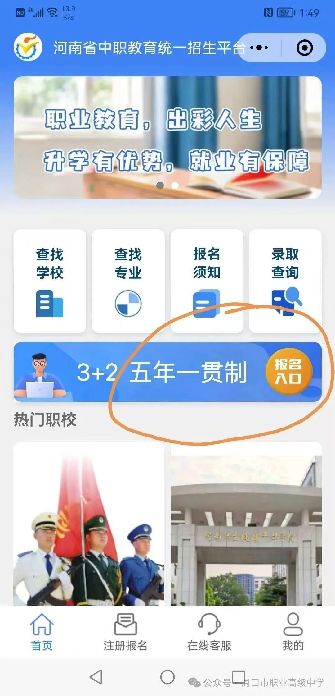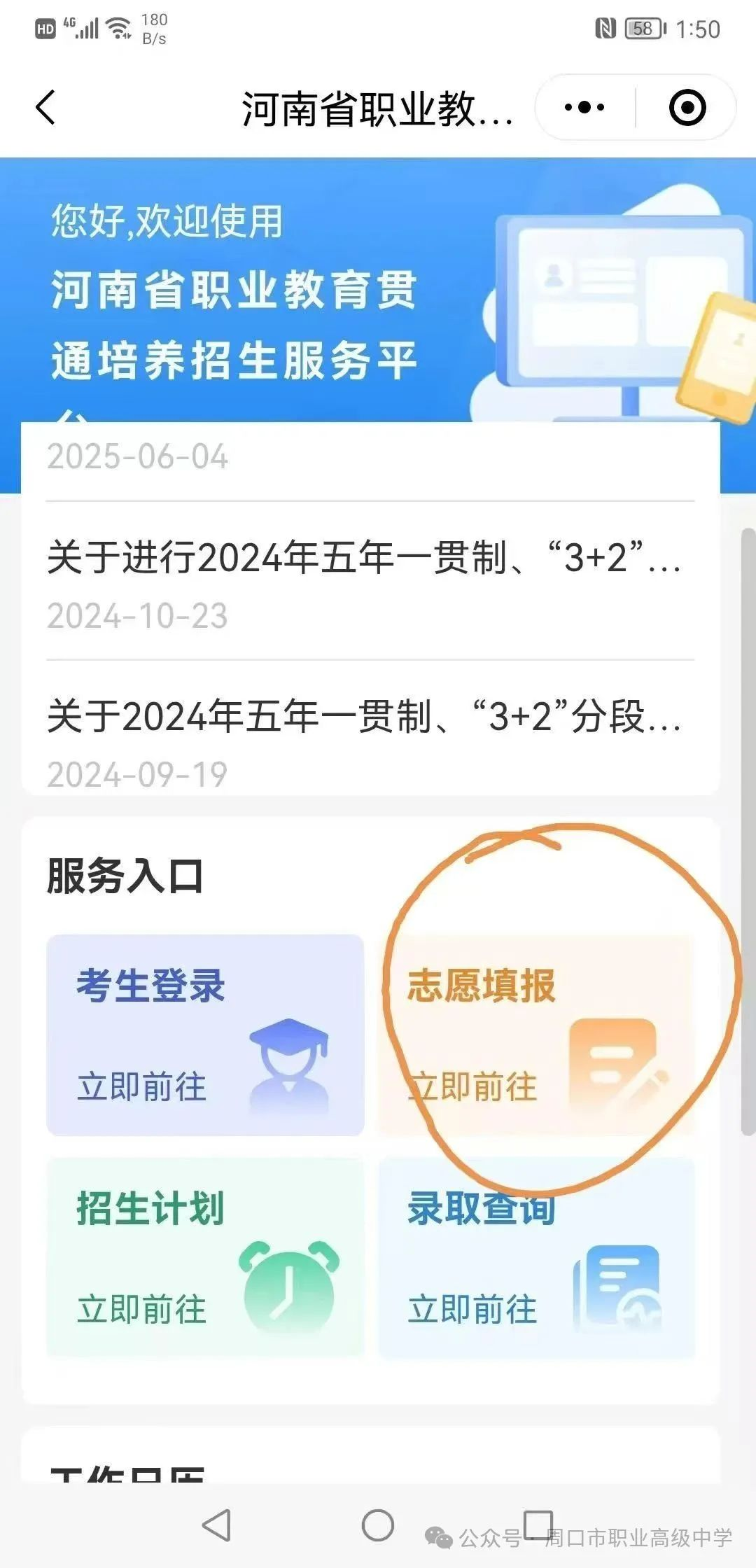 答:考生通过“河南省职业教育贯通培养招生服务平台”(网址:http://zjgt.haeea.cn)(简称贯通培养招生平台)进行网上志愿填报。也可以使用微信小程序搜索中职招生:打开中职招生小程序-点击五年一贯制报名入口-点击志愿填报-考生输入相关信息登录填报志愿并提交。
