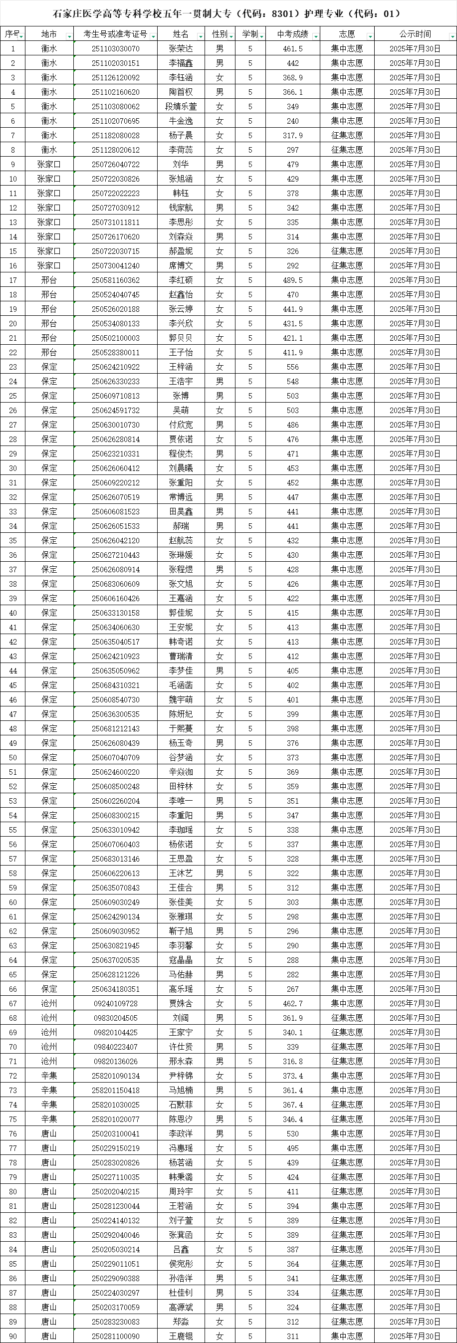 2025年河北省五年一贯制大专录取名单公示