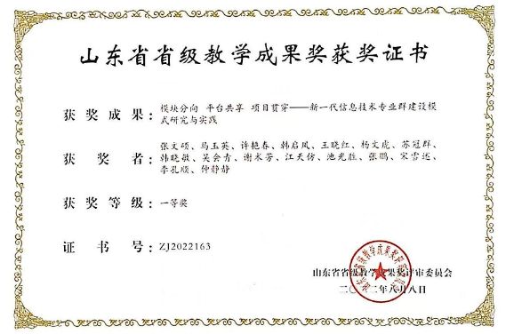 学院在教学建设中成果丰硕,形成了以“新基建信息技术专业群”为核心的特色发展格局。获国家级教学成果奖二等奖 1 项、省级教学成果奖一等1项,通信工业协会教学成果奖一等奖1项,电子学会教学成果奖特等奖1项,建成山东省高水平专业群1个、济南市产教融合试点专业群1个,省级特色专业1个、校企共建专业1个,省级黄大年式教师团队2支、职业教育教学创新团队2支。教师团队累计发表论文150余篇,其中SCI(EI)收录15篇,中文核心3篇,出版教材及专著30余部,主持或参与省级教科研项目30余项,授权专利20余项,软件著作权50余项。