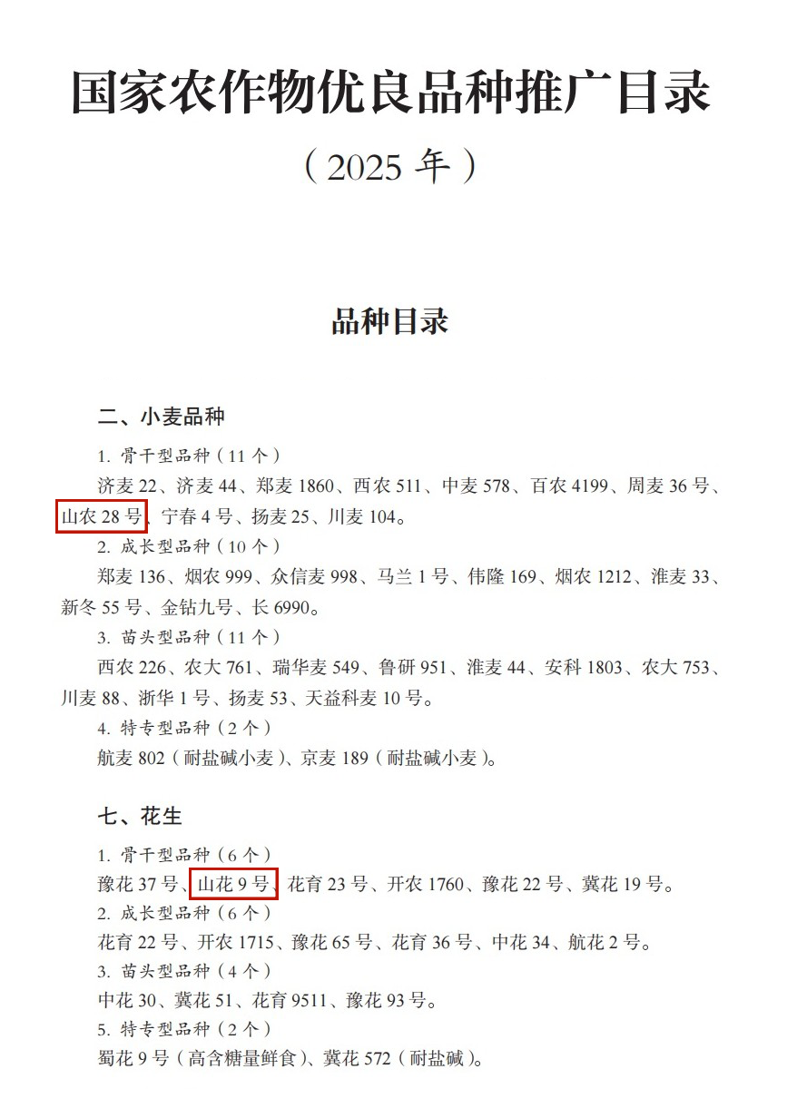近日,农业农村部发布《国家农作物优良品种推广目录(2025年)》,学校赵檀方教授团队培育的小麦品种山农28号和万勇善教授团队培育的花生品种山花9号入选2025年国家农作物优良品种推广目录(骨干型)。