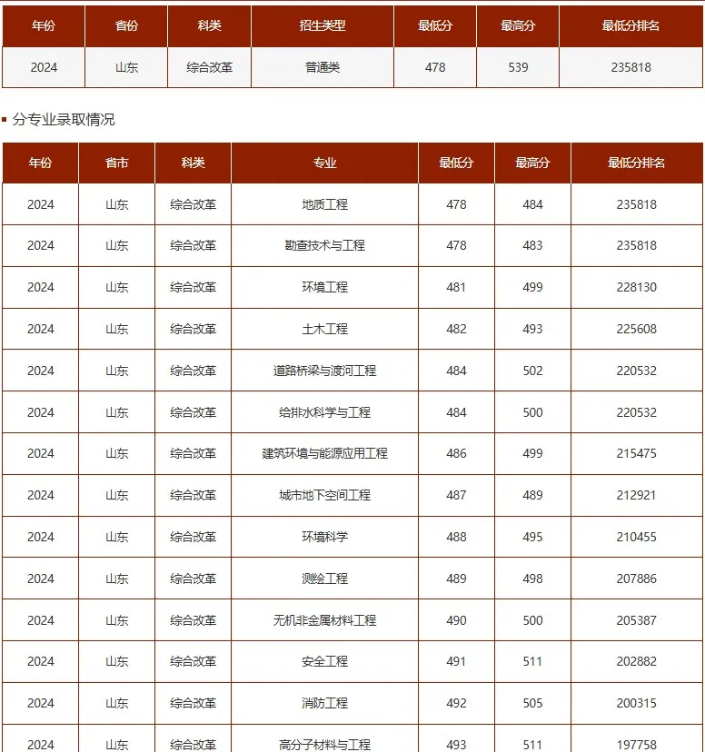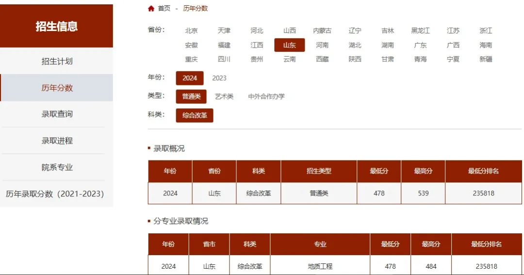 3.进入历年分数查询后,可按省份、年份、类型、科类查询专业最低分及排名。