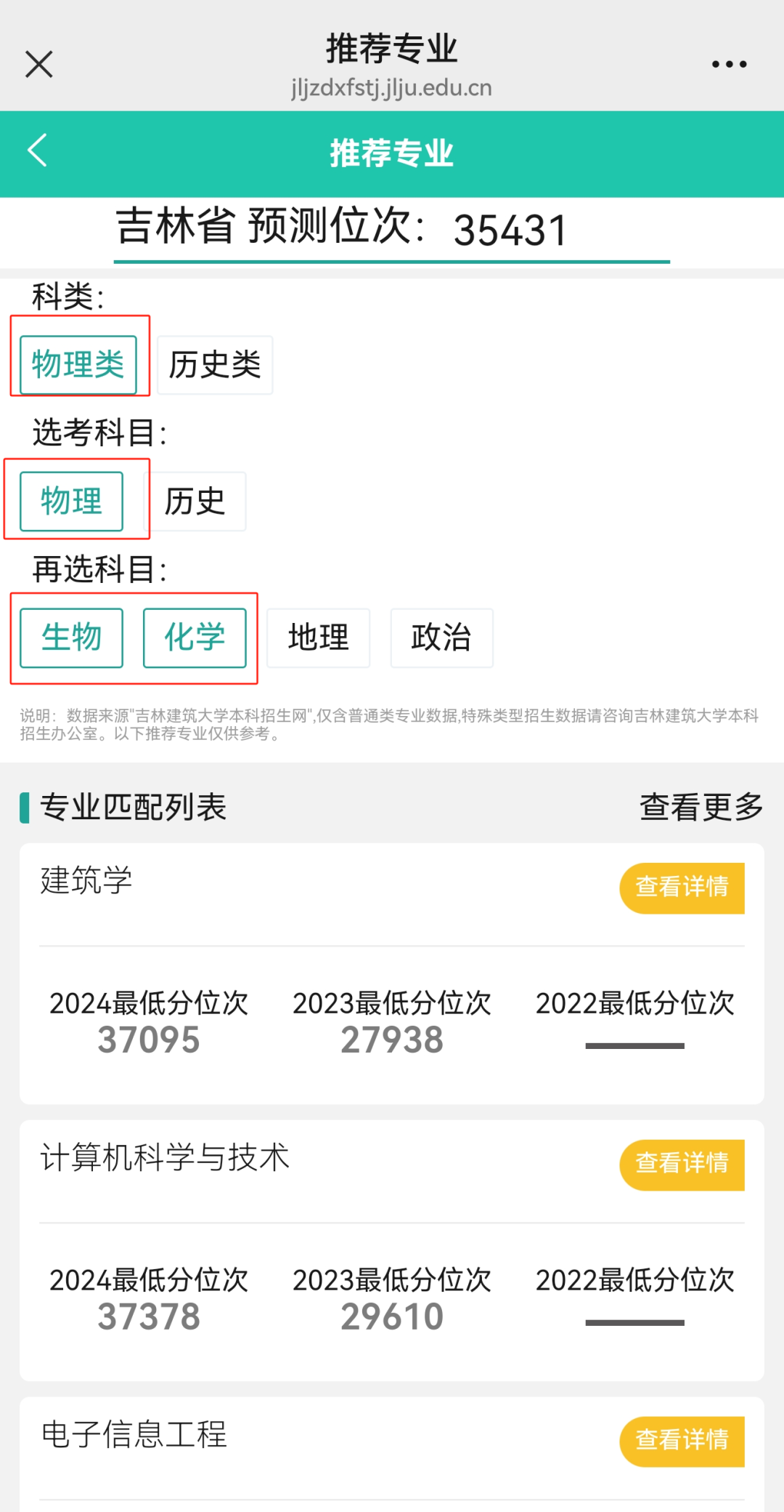 微信公众号搜索 “吉林建筑大学招生资讯” ,关注后,进入公众号,可以了解学校及专业概况、招生计划、历年录取分数等信息。点击 了解建大智能推荐专业模块,输入省份、分数、选择科目后,即可智能按照分数推荐专业。