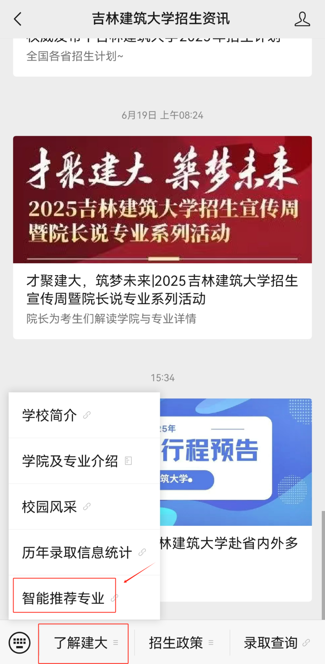 1、进入“ 吉林建筑大学招生资讯” 点击了解建大,选择智能推荐专业功能