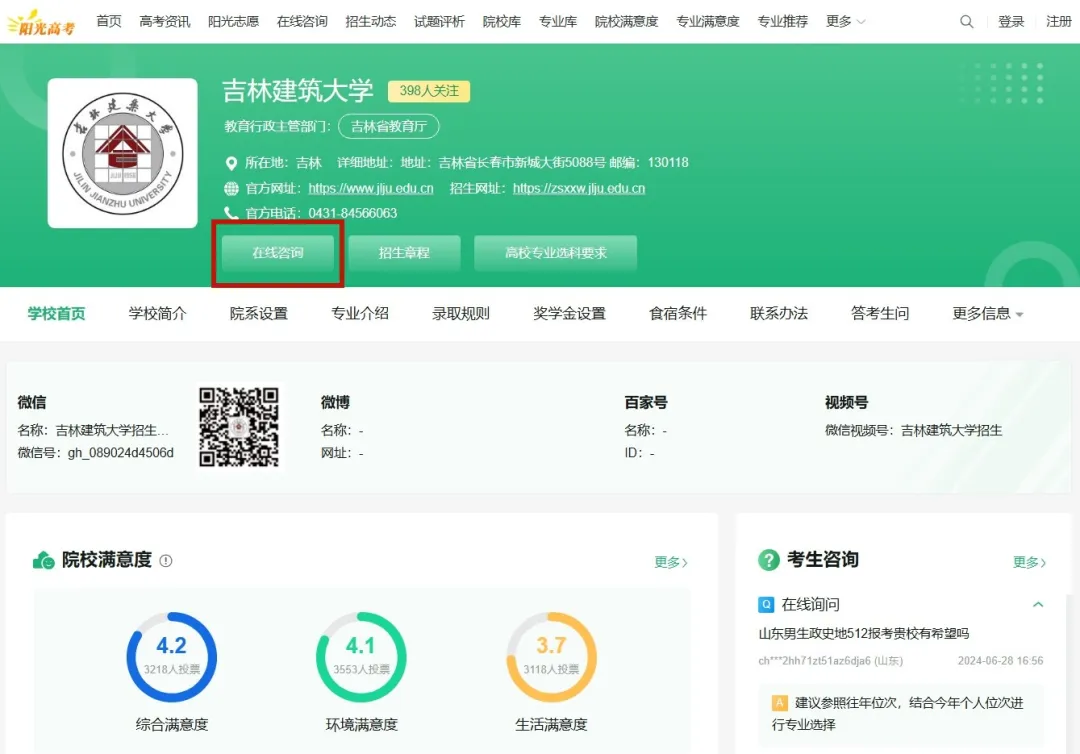 考生及家长可通过阳光高考网进行在线咨询,网址:https://gaokao.chsi.com.cn/。进入阳光高考网后,搜索或在院校查询“吉林建筑大学”,进入到学校界面后,可进行在线咨询、招生章程等信息的查询。并且可以进行在线咨询。
