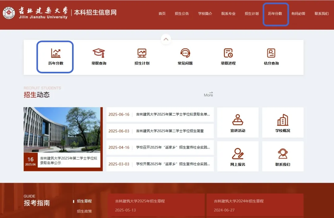 吉林建筑大学本科招生信息网是我校官方的招生宣传平台,网址:http://zsxxw.jlju.edu.cn/ 。考生及家长访问后,可查询我校专业介绍、历年录取分数、招生计划、招生政策、招生章程等各类招生信息,是我校本科招生信息最权威的发布平台。
