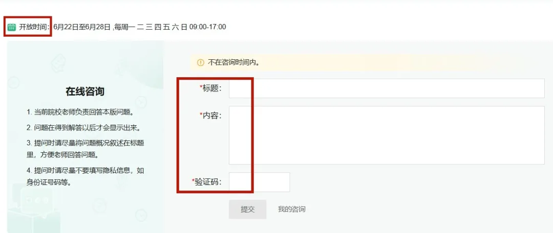 2.点击在线咨询,填写相应内容后进行线上问答。(需注意在线问答时间)