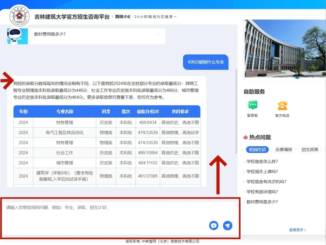 在本科招生信息网右侧的AI机器人,是我校的“招生智能问答系统”。点击AI机器人,可以对考生的线上提问、咨询等进行实时智能答疑。另外系统还对考生提出的高频及常见问题进行汇总,提高考生及家长查询效率。