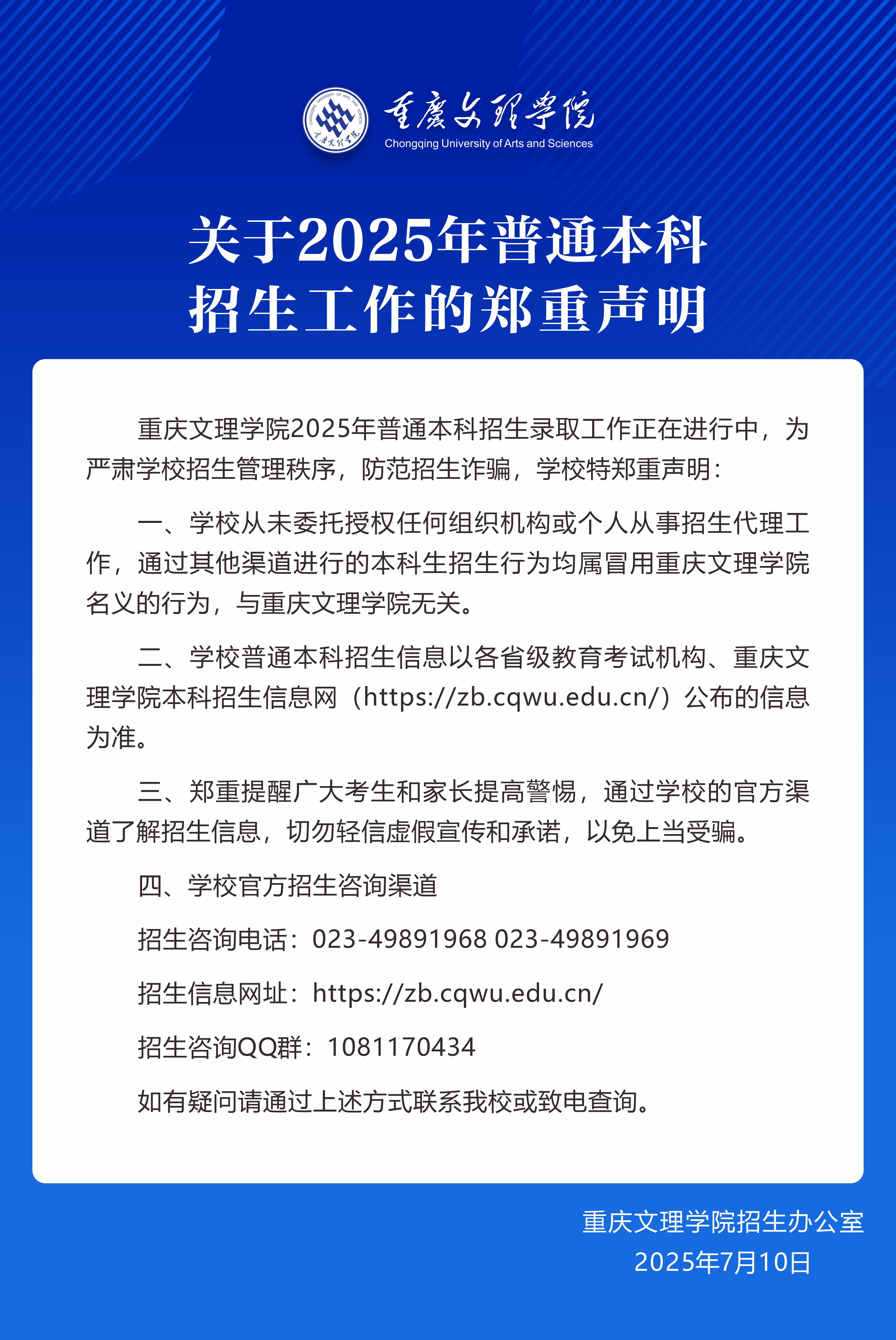 重庆文理学院关于2025年普通本科招生工作的郑重声明