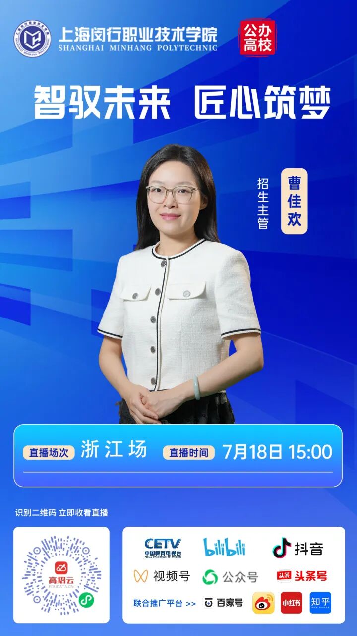 “智驭未来,匠心筑梦”上海闵行职业技术学院秋季高考浙江场招生宣讲将于7月18日周五下午3点整准时开播,扫描下方二维码预约,了解学校整体办学情况、办学特色与优势、招生政策与招生专业。