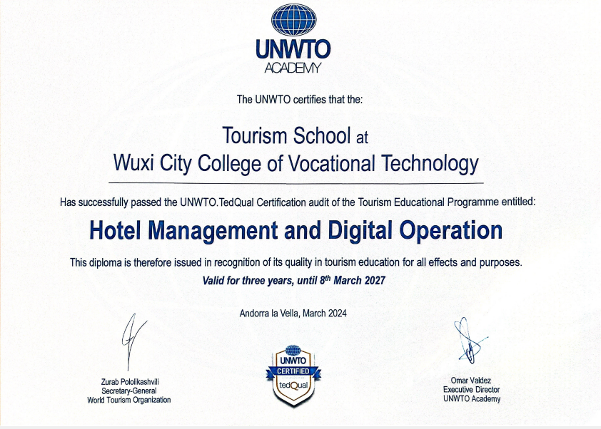 酒店管理与数字化运营专业通过联合国世界旅游组织旅游教育质量