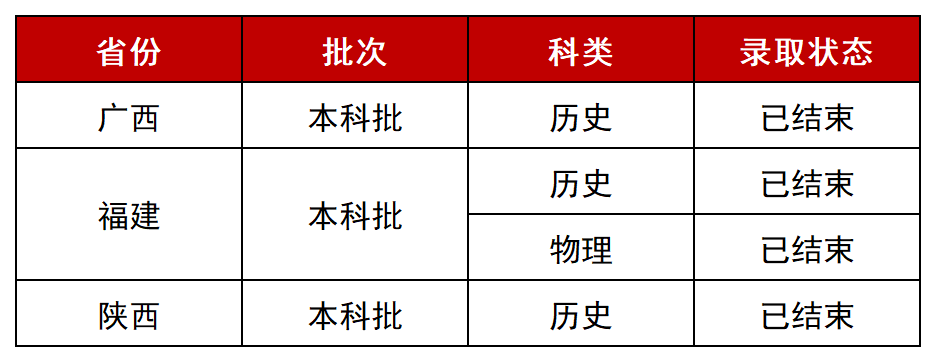截止7月24日,我校在广西、陕西本科批历史类;福建本科批录取结束,具体录取情况如下: