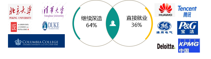 近三年,超过64%以上的毕业生前往国内外知名高校进行深造,其中包括清华大学、北京大学、伦敦政治经济学院、帝国理工学院、杜克大学、卡内基梅隆大学、哥伦比亚大学、多伦多大学等QS排名前100的世界一流高校;直接就业的毕业生中,超过60%的学生进入华为、腾讯、通用电气、宝洁等世界500强企业和国际四大会计师事务所工作。