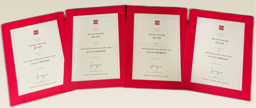 在ACCA全球统考中,5人次获全球第一,30余人次获中国大陆第一,5名教师获得ACCA颁发的优秀教师奖;连续12次获得ACCA优秀高校奖;2024年荣获“ACCA年度卓越教育奖、ACCA精英培育奖、ACCA教学进取奖、ACCA教学成果奖”四项大奖。
