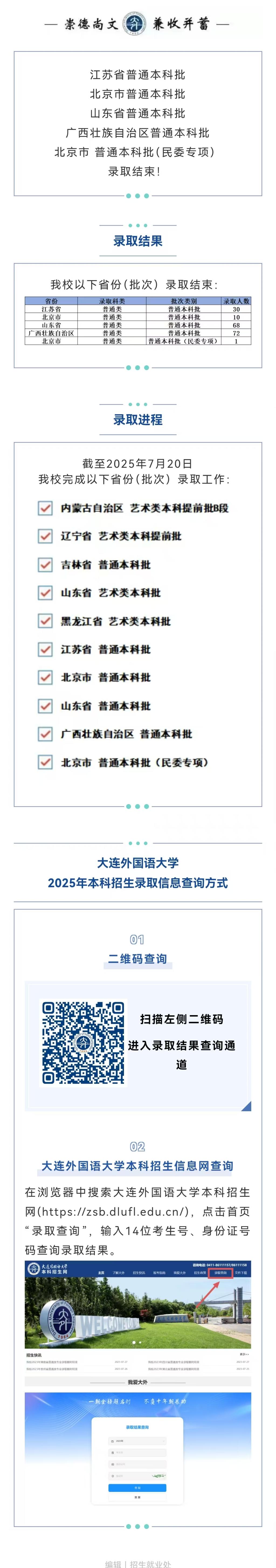 大连外国语大学2025年本科招生录取进度五:7月20日民委专项、江苏省、北京市、山东省、广西壮族自治区普通本科批录取结束!