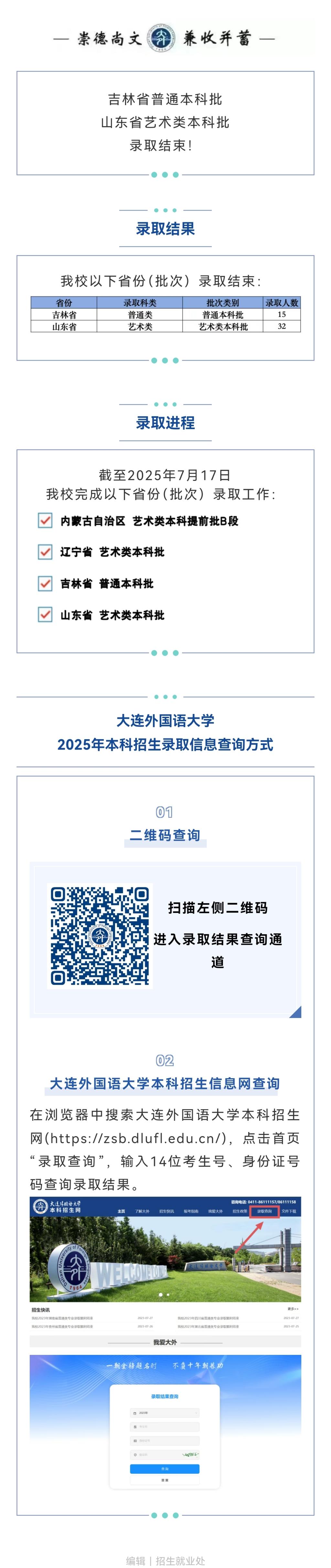 大连外国语大学2025年本科招生录取进度三:7月17日吉林省普通本科批、山东省艺术类本科批录取结束!
