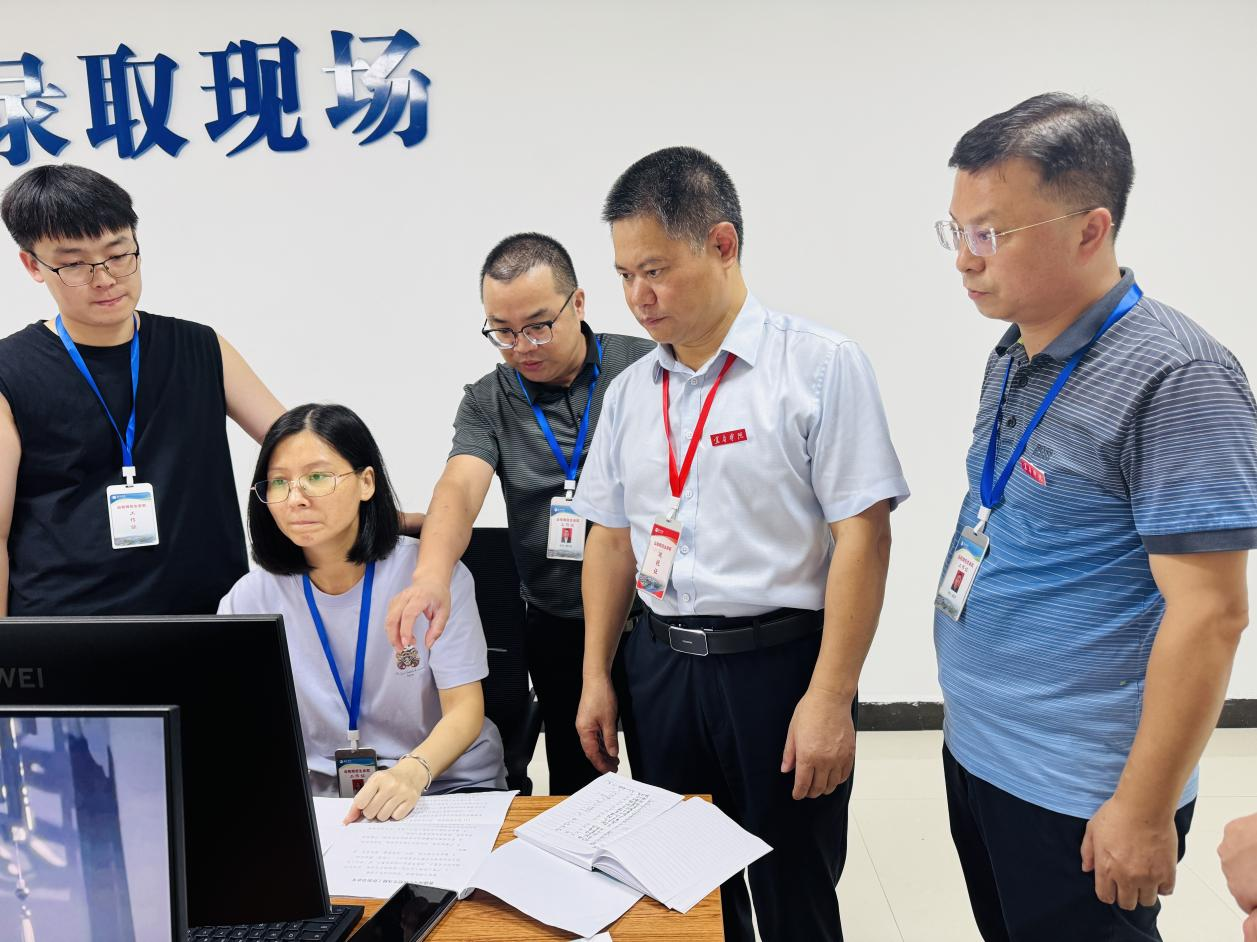 蔡海生校长现场指导高招录取工作 在录取现场,蔡海生校长、邱家明副校长分别听取了招生就业处处长段军平、副处长黄义强关于江西投档的情况汇报,仔细查看了考生档案审阅流程及相关数据,并对录取工作进行了强调与要求。