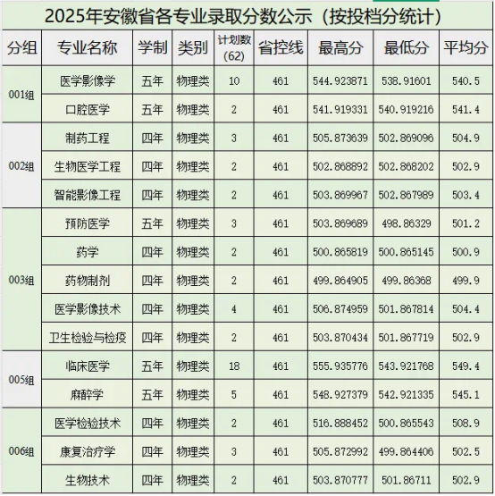 牡丹江医科大学2025年安徽省各专业录取分数公示(按投档分统计)