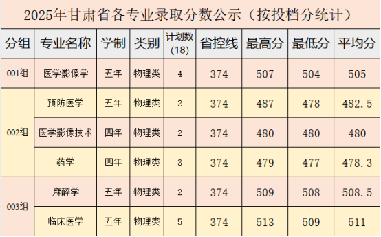 牡丹江医科大学2025年甘肃省各专业录取分数公示(按投档分统计)