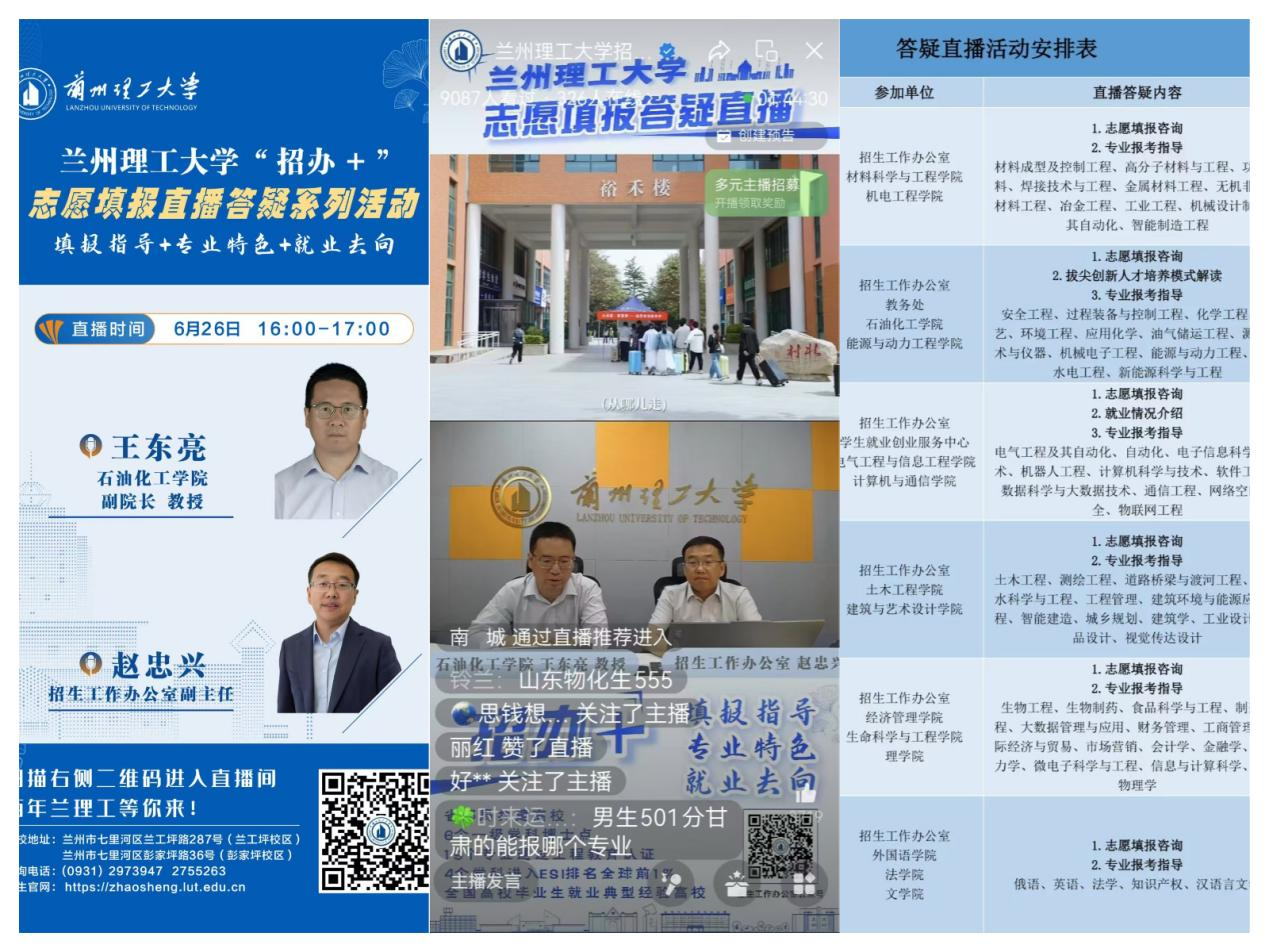 持续加大线上招生宣传力度,在不同时间节点先后推出“本科专业深度解读系列宣讲”“兰理工‘招办+’志愿填报答疑系列直播活”,累计直播超过30场次。其中“招办+”系列直播,场均观看量突破1万人次,累计传播量超12万次。直播涵盖“志愿填报技巧”“专业特色解析”“就业前景研判”三大模块,各学科教授与招办老师同台,以案例分析结合实时问答的方式,解答考生高频问题。其中,计算机类专业专场直播观看量达1.8万人次,评论区互动超800条,成为考生关注的焦点。