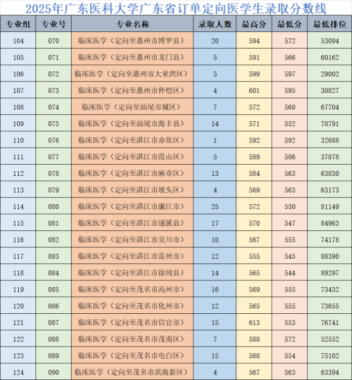 2025年我校提前批广东省订单定向医学生(卫生专项计划)招生225名,录取225名,一次性满档,总体生源质量保持稳定。录取最高分613分,排位17771,录取最低分544分,排位89297,高出卫生专项控制线(465分)79分提档。
