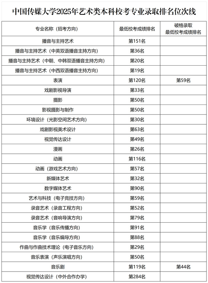 中国传媒大学2025年艺术类本科校考专业录取排名位次线