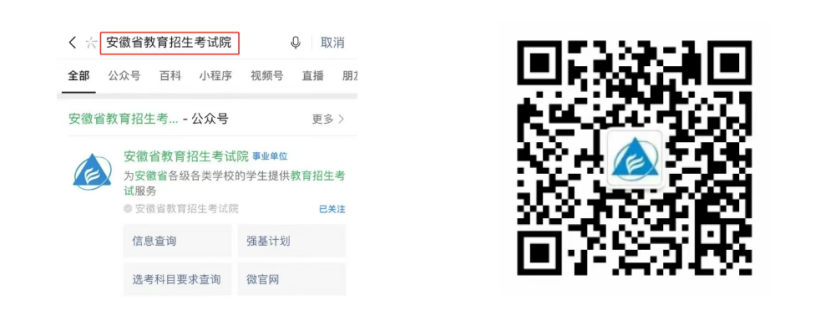 步骤一:在微信端搜索公众号“安徽省教育招生考试院”,点击“关注”,或直接扫描下方二维码添加关注。