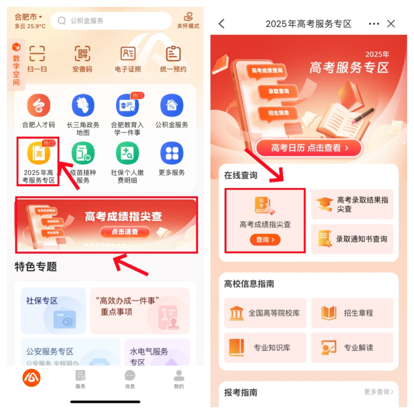 在皖事通APP内找到并进入“高考成绩指尖查”服务,输入考生相关信息即可查询。