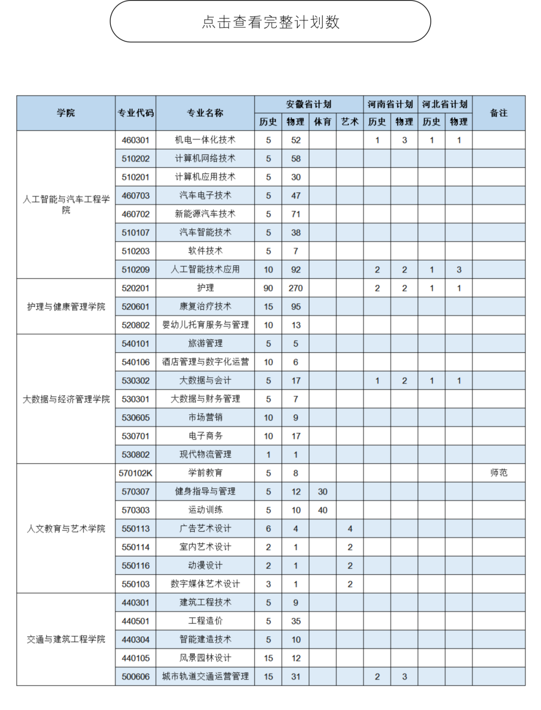 合肥经济技术职业学院是2001年6月经安徽省政府批准、教育部备案的全日制高等职业院校,致力于培养面向社会、紧贴经济、聚焦一线的高技能人才。学校设有人工智能与汽车工程学院、护理与健康管理学院、大数据与经济管理学院、人文教育与艺术学院、交通与建筑工程学院、马克思主义学院、公共基础课教学部、继续教育学院等8个教学单位,开设计划内高等职业教育专业39个。目前在籍学生达12000余人。