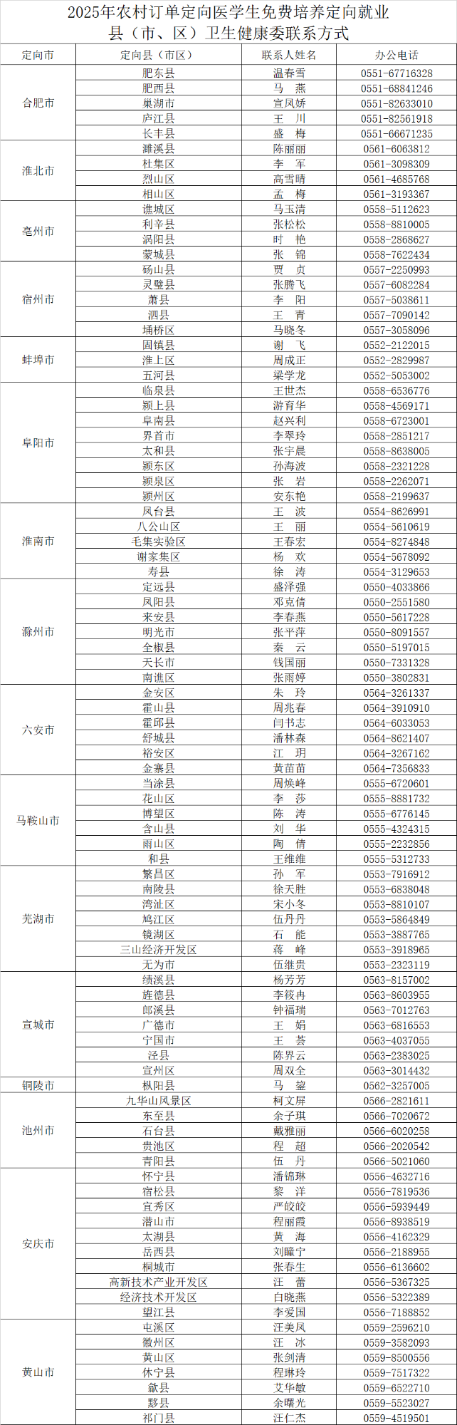 合肥职业技术学院2025年农村订单定向免费医学生录取工作已完成并报安徽省卫健委。请每位已录取到我校的考生积极联系相应的定向县区,按省卫健委要求尽快和定向县区签订就业协议,并将已签字盖章的就业协议书、本人身份证复印件(未成年附监护人本人身份证复印件),所有材料一式两份于2025年8月10日前快递到我校教务处招生办,收到签订的就业协议后发放录取通知书。