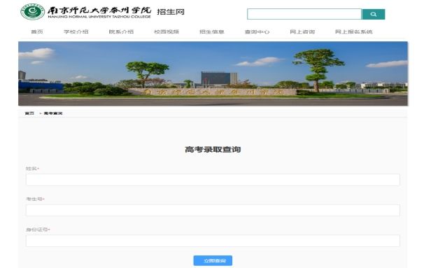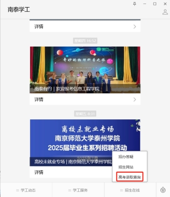 考生可关注“南泰学工”微信公众号,在公众号下方菜单栏“招生在线”,点击“高考录取查询”,即可进入查询页面。
