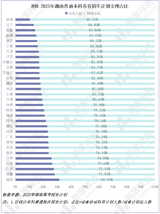 今年有16个省份在湖南招收物理科目考生的占比超过80%,其中青海占比最高,达到89.51%。招物理考生占比最低的是海南地区,但其占比仍接近七成。
