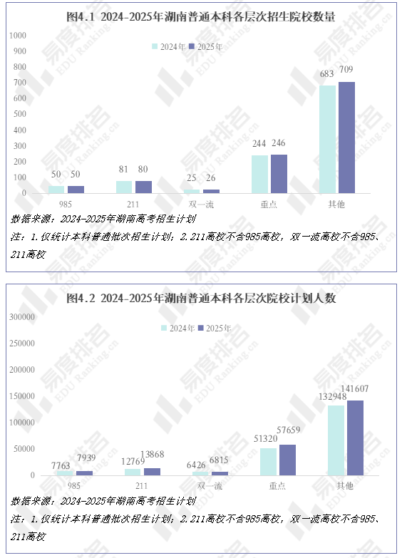 近两年在湖南招生的重点及以上层次院校数量基本稳定,各层次的招生计划人数均有所增加,整体报考难度有所下降。