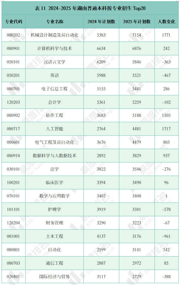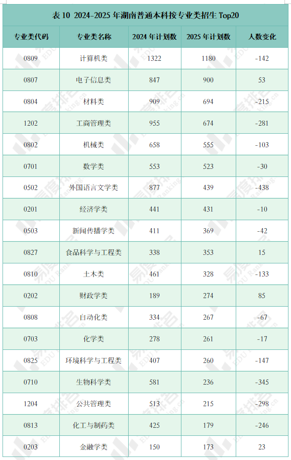 今年招生计划数前20的专业类中,有16个专业类计划人数较去年减少,仅