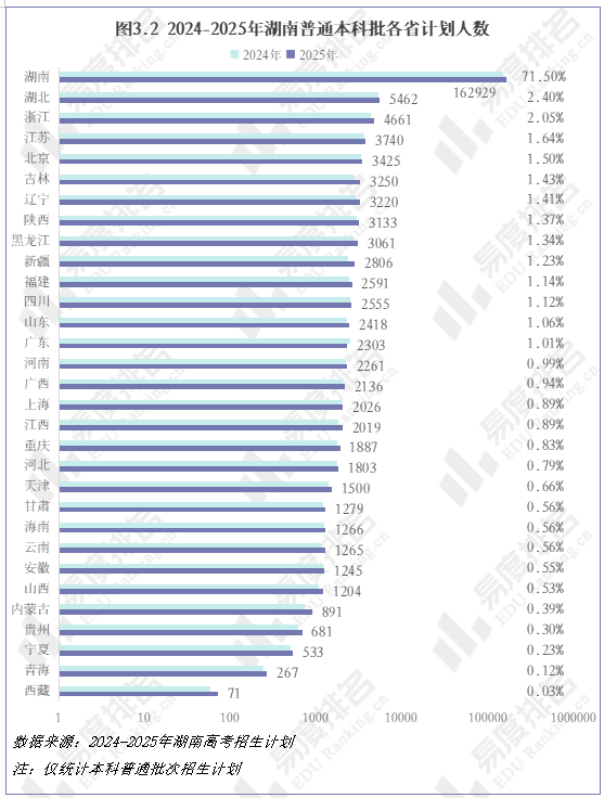 2025年高考在湖南本科普通批计划招生22.8万人,较去年增加7.9%。今年湖南省内高校计划招生16.29万人,较去年增加超1.2万人,省内高校招生名额占全国总计划的比例约71%。