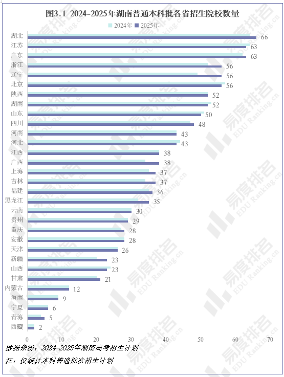 今年湖北的招生院校数最多,达到66所,湖南本省的院校为52所,在各省中排名第7位。今年湖南省内高校计划招生人数达到16.3万人,省内院校计划人数占比达到71%。除广东外,其他各省的招生计划相比去年均增长。