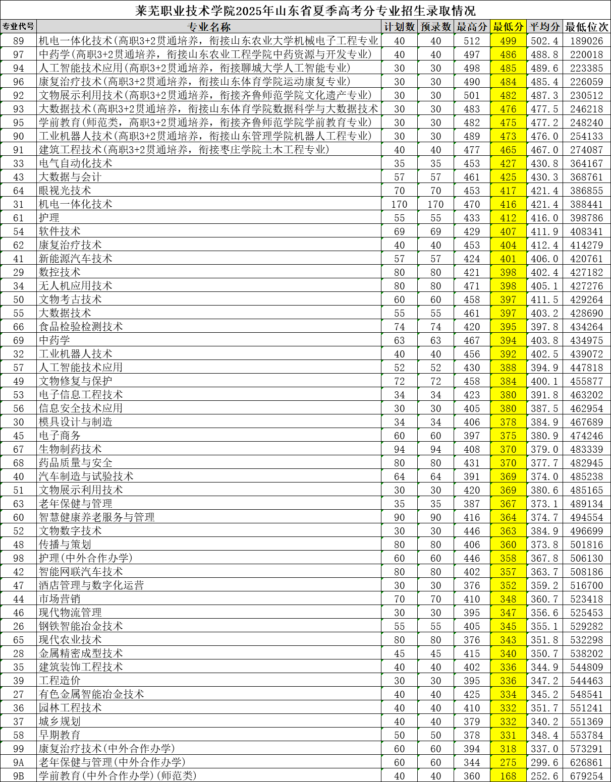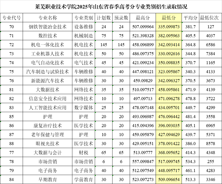 莱芜职业技术学院2025年山东省分专业类别招生录取情况(夏季高考、春季高考录取分数线)