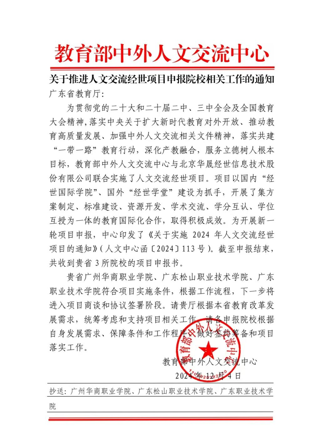学校成功入选教育部中外人文交流中心“人文交流经世项目”实施院校,是广东省3所获批院校之一。与澳大利亚、英国、新加坡等10个国家和地区近20余所高校签订了合作协议,国际班招生规模同比增加,国际班“外语+专业”的教学特色显著。同时,与澳大利亚国际商学院等联合开设共融课程23门,承办了由广东省人民政府侨务办公室等联合指导的“华商杯”华侨华人青年跨境直播电商技能训练营,组织学生参加了香港研学,组织优秀学生赴法国、新加坡等国家研学。