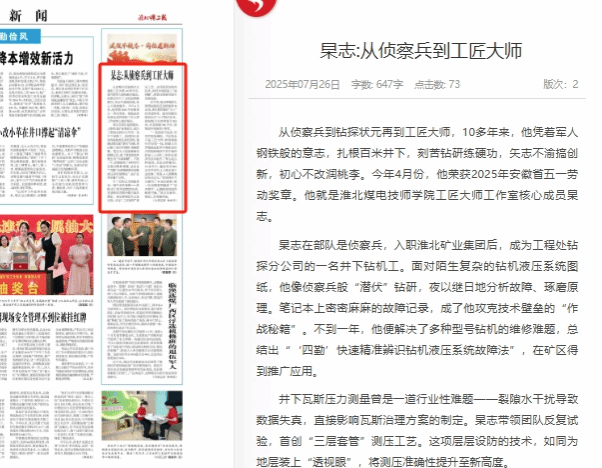 杲志在部队是侦察兵,入职淮北矿业集团后,成为工程处钻探分公司的一名井下钻机工。面对陌生复杂的钻机液压系统图纸,他拿出当侦察兵时的劲头潜心钻研,夜以继日地分析故障、琢磨原理。笔记本上密密麻麻的故障记录,成了他攻克技术壁垒的“作战秘籍”。不到一年,他便解决了多种型号钻机的维修难题,总结出“四勤快速精准辨识钻机液压系统故障法”,并在矿区推广应用。井下瓦斯压力测量曾是一道行业性难题——裂隙水干扰导致数据失真,直接影响瓦斯治理方案的制定。杲志带领团队反复试验,首创三层套管测压工艺。这项层层设防的技术,如同为地层装上“透视眼”,将测压准确性提升至新高度。