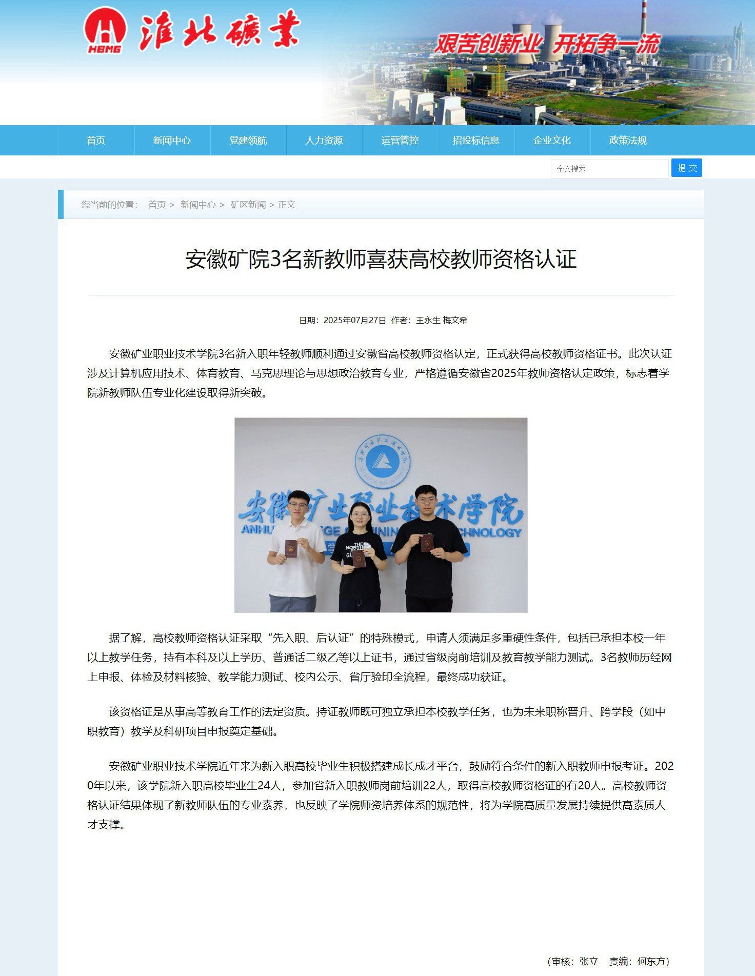 安徽矿业职业技术学院3名新入职年轻教师顺利通过安徽省高校教师资格认定,正式获得高校教师资格证书。此次认证涉及计算机应用技术、体育教育、马克思理论与思想政治教育专业,严格遵循安徽省2025年教师资格认定政策,标志着学院新教师队伍专业化建设取得新突破。