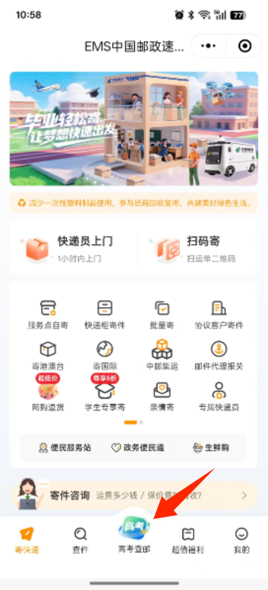揽件后,EMS将短信通知新生。新生也可访问“EMS邮政速递”微信小程序、池州学院招生信息网,进入“录取查询”查询快递单号及物流信息。