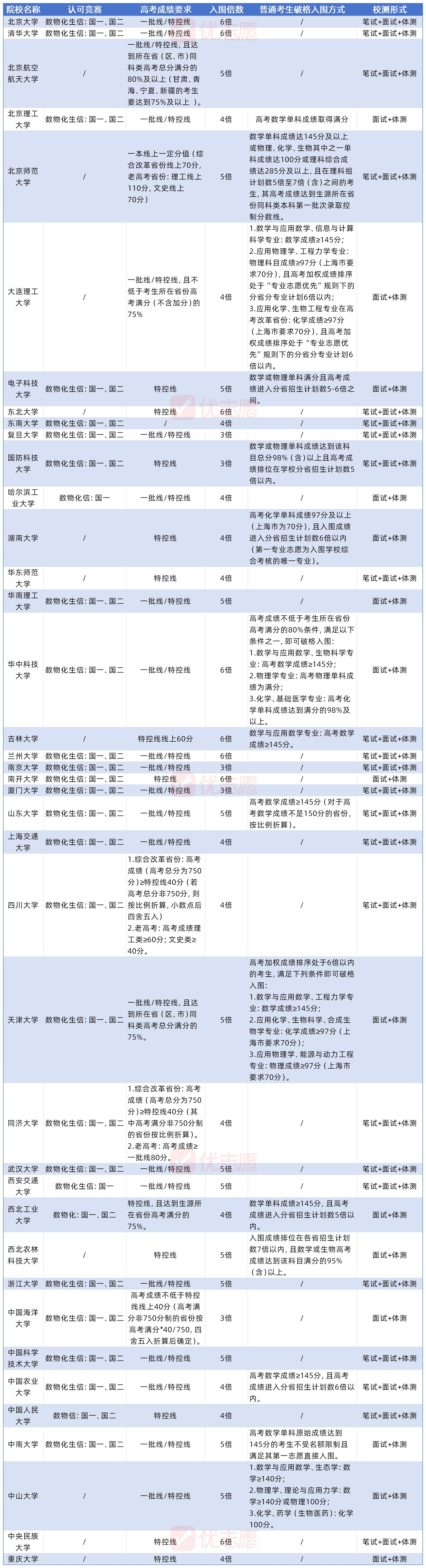 4、校测(6月下旬-7月初):一般包括笔试、面试和体测。笔试主要考查基础学科知识的深度和广度,部分高校的笔试题难度可达竞赛水平;面试则侧重考查学生的综合素质、创新思维、专业认知以及对社会热点的关注和分析能力等。
